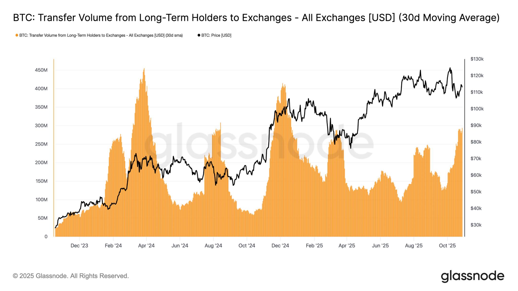 To gauge the intensity of long-term holder selling, we can look at the transfer volume of long-term holders to exchanges (30-day simple moving average), which captures the value of tokens moved by seasoned investors for potential sale. This metric has surged to about $293 million per day, more than double the widely observed benchmark level of $100 million to $125 million since November 2024.