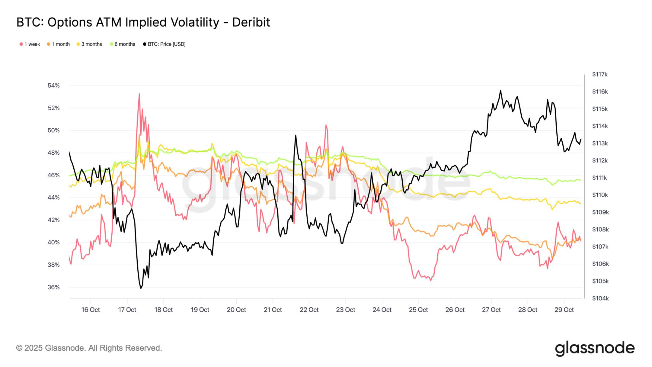 Turning to the options market, recent data shows that the volatility pressure following the plunge on October 10 continues to ease. Bitcoin's 30-day realized volatility has dropped to 42.6%, slightly down from 44% last week, reflecting a calmer price movement. Meanwhile, the implied volatility, which represents trader expectations, has decreased more sharply as participants unwind downside hedges and reduce protection demand.