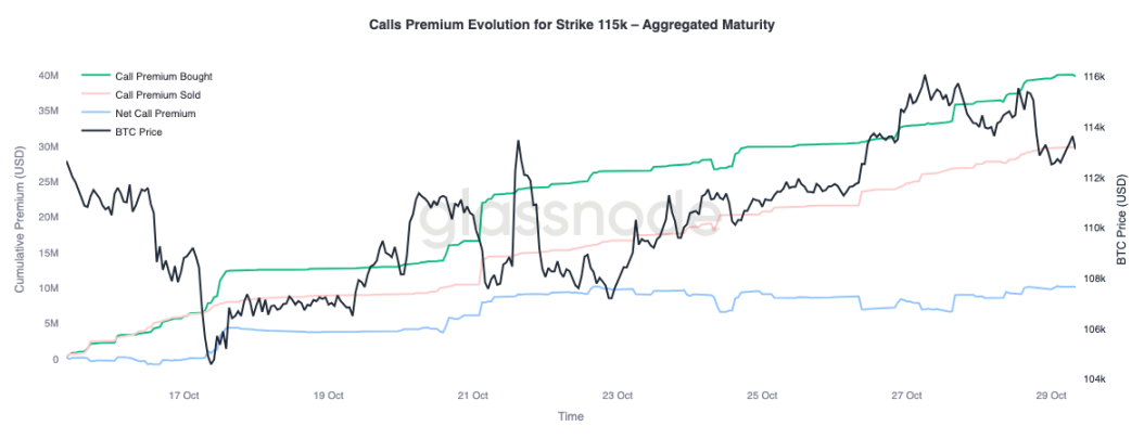 As skew normalizes, attention turns to where traders are directing their premiums. Call option activity now varies significantly by strike price. At the $115K strike price, net buying of call options remains positive, indicating that traders continue to pay for recent upside potential as prices have recovered over the past two weeks. In contrast, at the $120K strike price, sold call options exceed bought ones, resulting in a net premium that is negative.