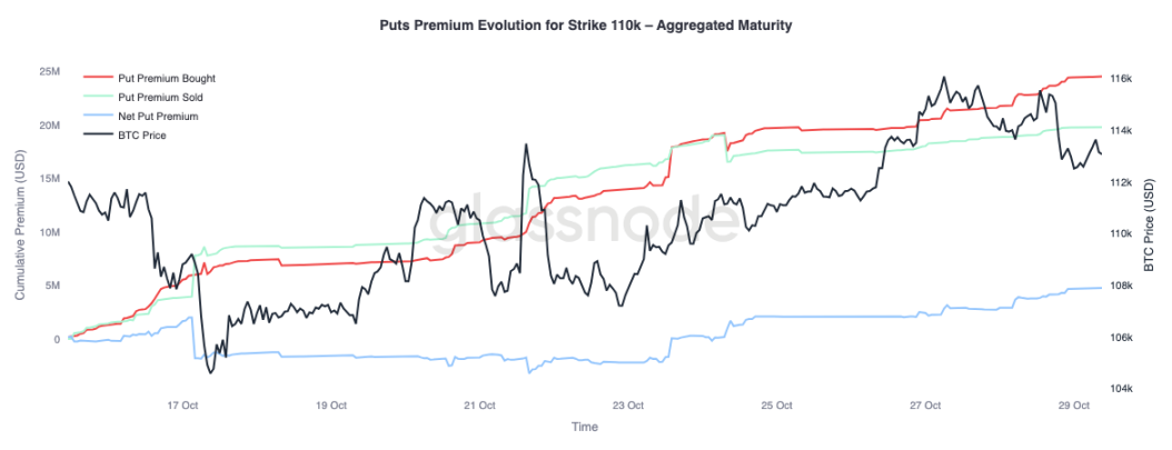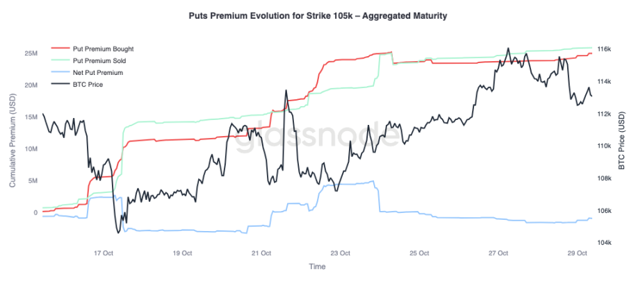 To complete the overall picture, we can turn to the bearish options side of the market. Since October 24, as Bitcoin has pushed higher, traders have been buying $110K put options, indicating demand for recent downside protection. Meanwhile, $105K put options have been sold more aggressively, suggesting that participants are willing to collect premiums by providing insurance at that deeper strike price.