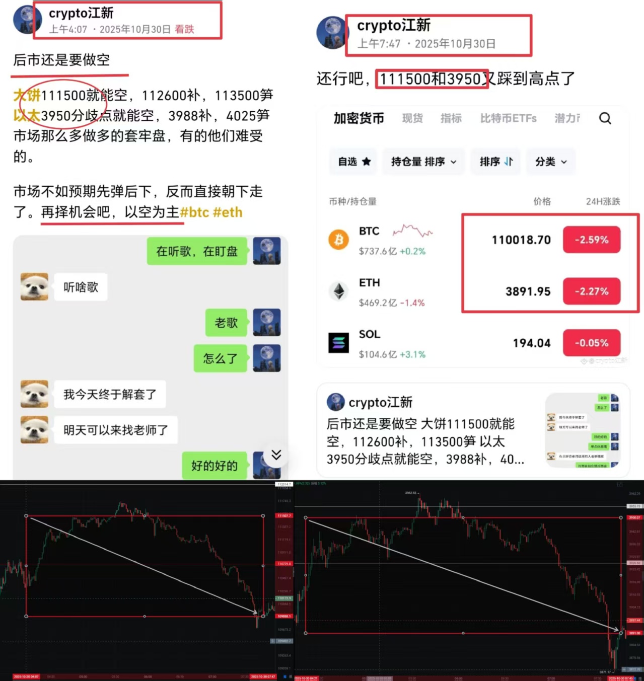 Good evening everyone, I am Jiang Xin. Recently, the rhythm of short positions has been very strong. Yesterday, the news caused the market to move very quickly, without a prior rebound, and closed the door on the bulls. The liquidation of Bitcoin and Ethereum amounted to over a hundred million dollars, which for those of us who are bearish and shorting, is merely a blessing. For us, it is just a matter of taking a smaller portion. After the first wave of selling at two o'clock, Jiang Xin opened his eyes wide in anger, seeing through the market, and gave the high points of Bitcoin at 111500 and Ethereum at 3950. These two positions were validated by the market, thus opening the curtain for a six consecutive harvest within the day. Today, you should not have seen anyone handle it better than I did.
