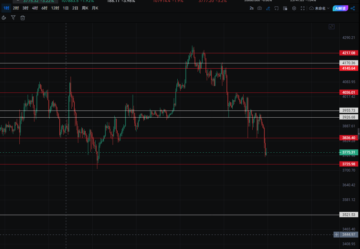 Let’s take a conservative approach: short at 108800, stop loss at 110000, and for long positions, only consider a gamble at 105800 with a stop loss at 105000, conservatively at 103800 with a stop loss at 103200. For Ethereum, short at 3850, add at 3900, stop loss at 3925, and for rebounds, enter at 3720 with a stop loss at 3680.