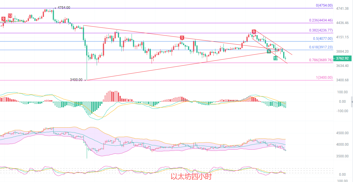 The four-hour K-line has formed a descending channel. In the short term, the K-line has approached the bottom support of the descending channel and the golden ratio 0.786 intersection point at 3,690. The EMA trend indicator has once again begun to alternate and expand downwards. The MACD continues to shrink while accumulating, and after the K-line broke below the 0.618 line at 3,917, it has been moving down around the lower track of the Bollinger Bands at 3,760. This indicates that the bearish trend continues. Friends who have not entered the market should pay attention to the resistance point above at 3,850.