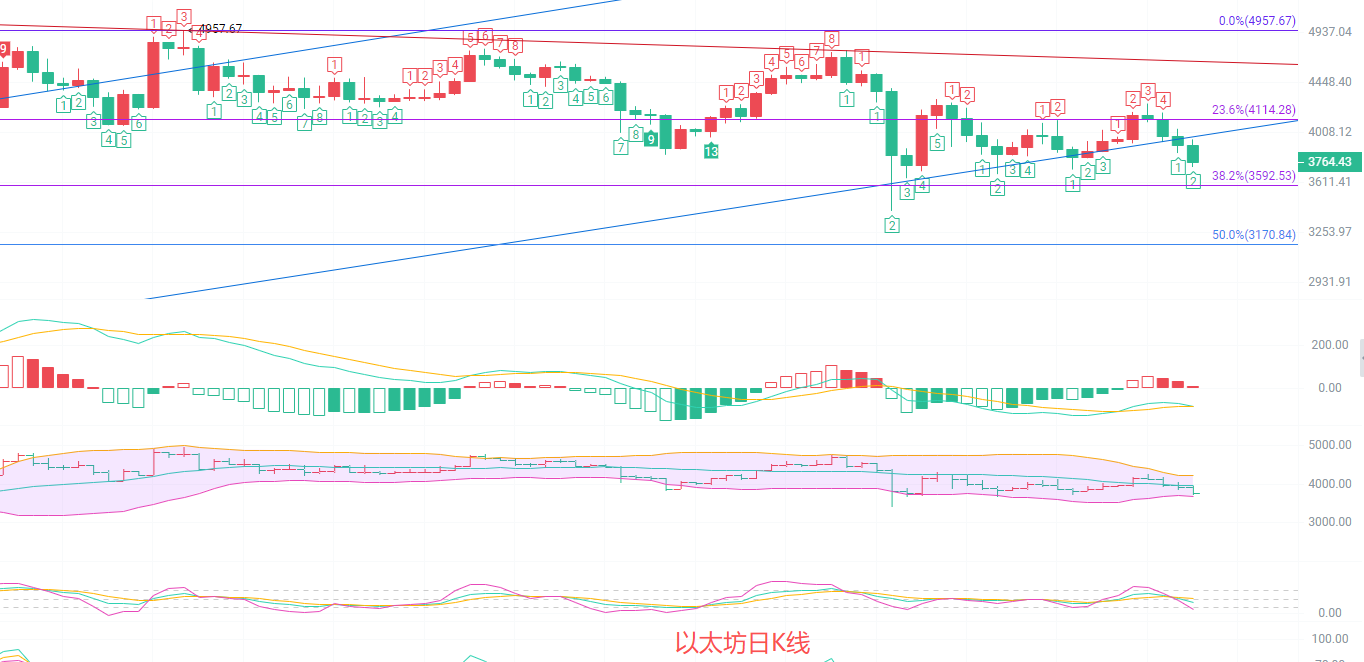 The current price of Ethereum is 3,770. It is now 2 AM Beijing time. The continuous pullbacks in the highs are opportunities to go south. Missing the opportunity to go south at 4,000 and yesterday's 3,930 means the next opportunity to go south is around 3,850. As for going north, it requires new news to stimulate it. With negative news and technical pullbacks, the bearish trend will continue.