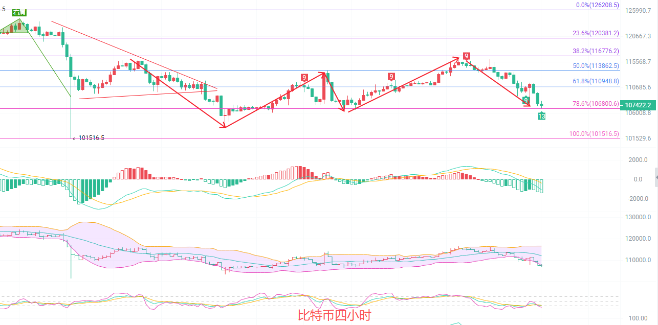The four-hour K-line has dropped from a high of 116,000 to the support of the 786 division line at 106,800, nearly a 10,000-point drop. The short-term market has entered an extremely oversold condition. Now the market is at a critical support level. If the support holds, the market will likely consolidate in the range of 105,000 to 110,000 in the short term. The MACD continues to increase in volume while shrinking, and the K-line is sticking to the lower track of the Bollinger Bands at 107,800, indicating a bearish trend. Congratulations to the crypto friends heading south; for the cautious ones, if the bottom support at 106,500 holds, you can take profits or leave a little position. It's up to everyone.
