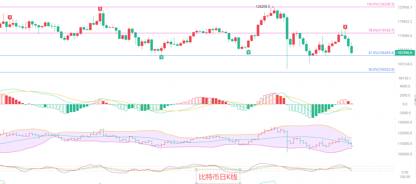 As of the time of this report, the daily K-line reached a high of 111,565, while the low is still pending, as it continues to dip below 107,000. The next key support level is the golden ratio 0.618 support at 106,450. If this level is lost, the downside space will open up for further declines. The MACD is expanding, and if it loses the 618 level, it will turn into a shrinking downward trend. The DIF and DEA are forming a death cross below the 0 axis, indicating a strong bearish trend. After losing the middle track of the Bollinger Bands at 110,500, the K-line began to impact the lower track support at 105,100. If this line is lost, the next step will be the 100,000 mark.