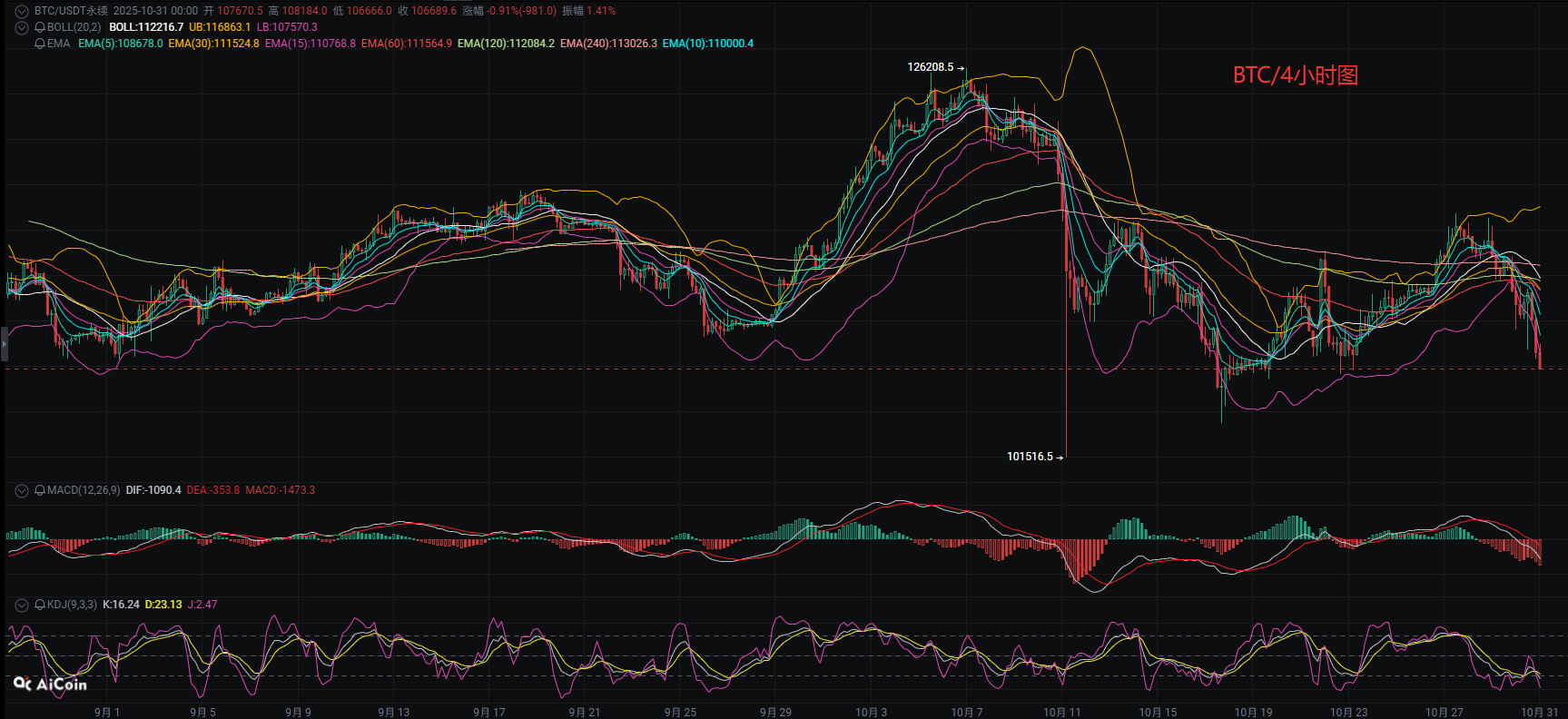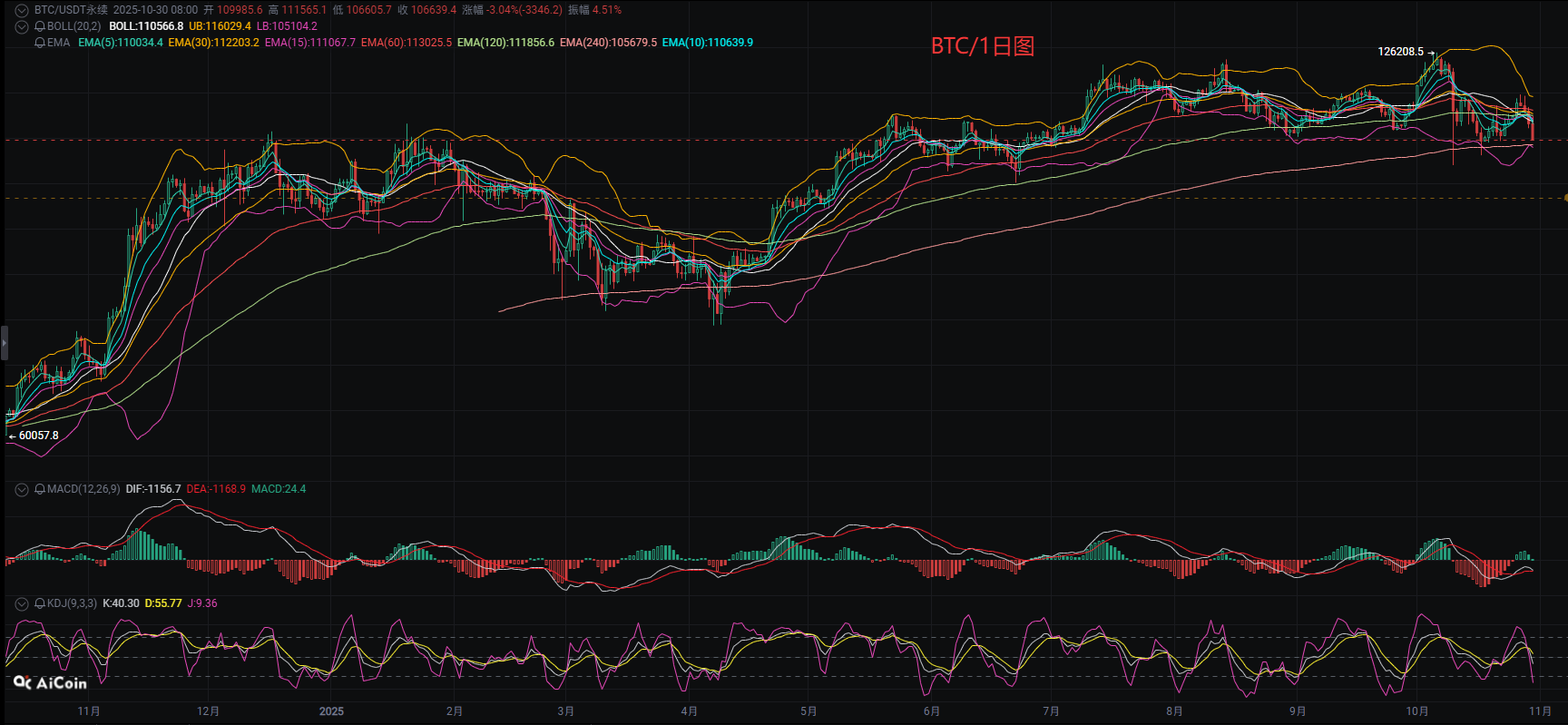 Bitcoin continues its downward trend during the day, with a drop of over 5000 points, and the market has fallen below the 110,000 mark, continuing to move downward. The current price is around 107,000, and the overall market is weak. The strategy remains focused on short positions during rebounds. If it falls below the 106,600 line again, consider lightly entering short positions. The overall correction of Bitcoin has not yet ended, so for those looking to hold long positions for the long term, it is still recommended to wait and see for now.