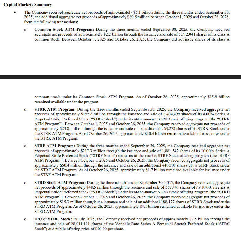 而实际上在2025年第三季度的财报表明,截止到 2025年10月26日 MSTR 通过多个 ATM 程序的剩余发行额度合计约 421 亿美元,说人话就是 MSTR 最大可以买价值 421 亿美元的 Bitcoin 。
