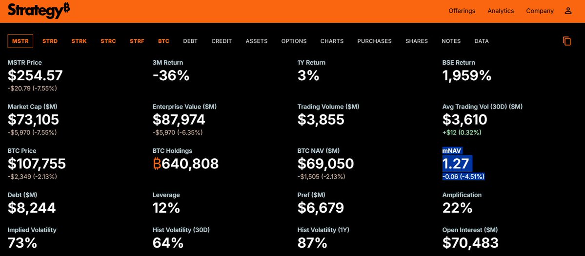 当前 mNAV 1.27x(低于 2.5x),所以 MSTR 可能仅用于债务/股息支付,而非大举买 BTC。这解释了第三季度买入放缓(仅 22 亿美元)的原因。