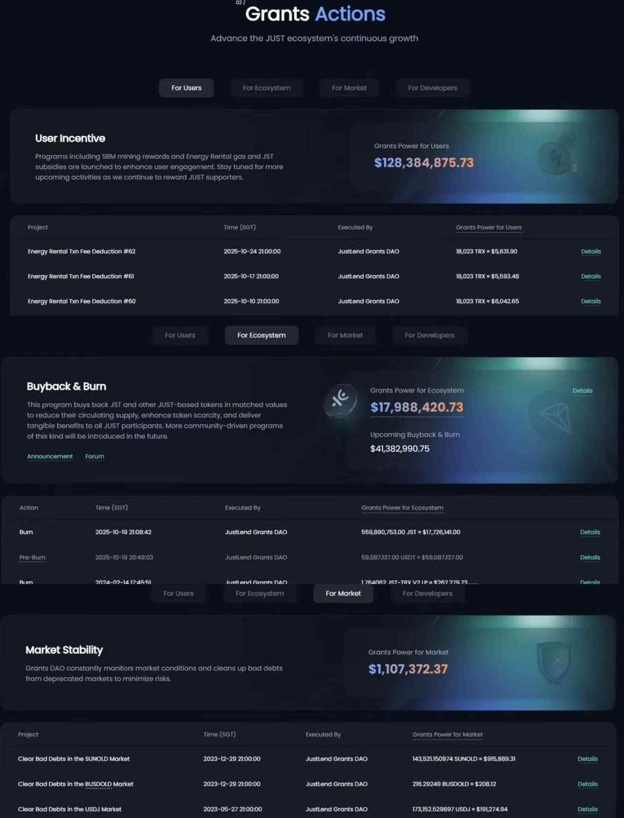 对GrantsDAO 而言,执行JST 回购销毁仅是其众多核心职能之一。作为JustLend DAO社区主导的激励组织与生态赋能核心机构,Grants DAO的核心使命是为开发者、贡献者及所有生态建设项目提供全方位支持,同时致力于维护市场的稳健与繁荣。