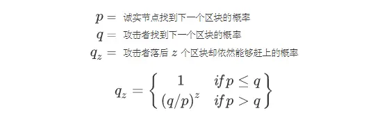 The probability of the attacker catching up from a lagging position is similar to the gambler's ruin problem. Suppose a gambler with infinite chips starts from a deficit and is allowed to gamble infinitely, aiming to fill the existing deficit. We can calculate the probability that they will eventually fill the deficit, which is the probability that the attacker can catch up to the honest chain.