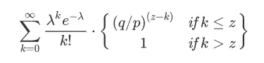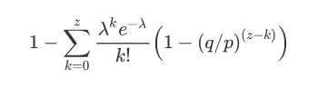The recipient waits until the transaction is packaged into a block, and a subsequent block has been added. They do not know how far along the attacker's work is, but they can assume the average time spent generating honest blocks; the attacker's potential progress follows a Poisson distribution with an expected value of:
