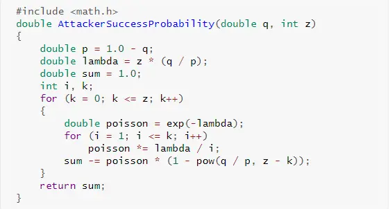 Since we have assumed that the number of blocks the attacker needs to surpass is increasing, their probability of success will decrease exponentially. When the odds are against them, if the attacker does not get lucky with an early lead, their chances of winning will diminish as they fall further behind.