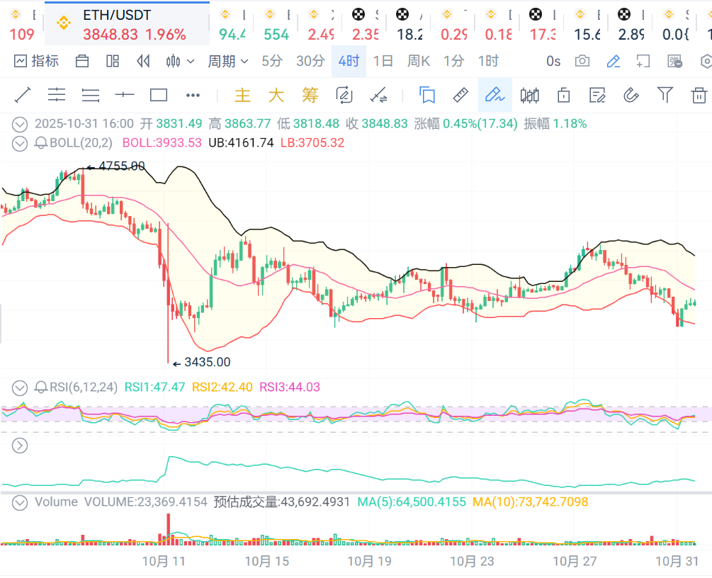 ETH: On the 4-hour chart, the price continues to stay below the middle band of the Bollinger Bands, and the price trend remains weak, with a support level of 3830 and a resistance level of 3860.
