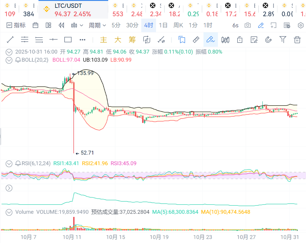 LTC: The price continues to stay below the middle band of the Bollinger Bands, and the price trend remains weak, with a support level of 93 and a resistance level of 96.