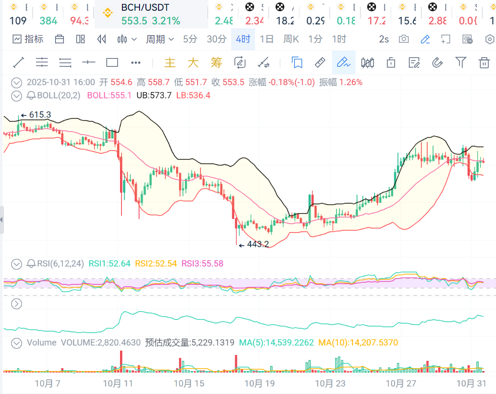BCH: The price continues to fluctuate near the middle band of the Bollinger Bands, and the price trend is average, with a support level of 540 and a resistance level of 570.