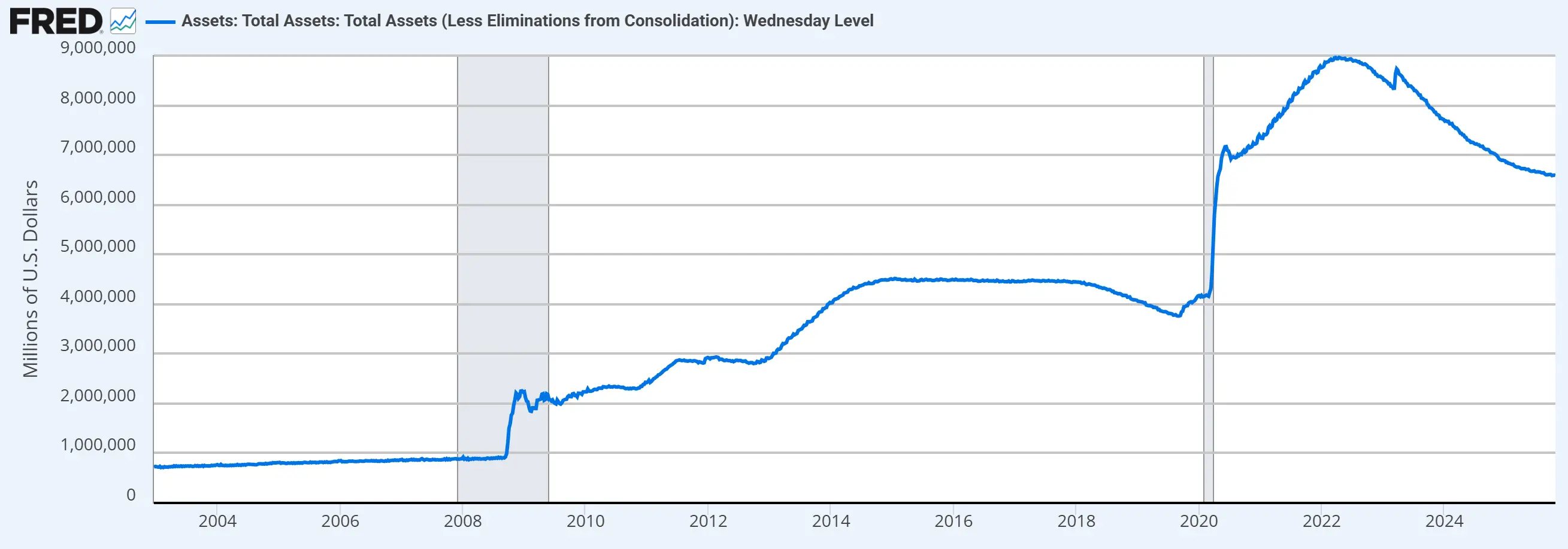 Currently, the Federal Reserve is still in the process of balance sheet reduction, but the pace has noticeably slowed. Since April of this year, the Fed has reduced the monthly limit for Treasury bond redemptions from $25 billion to $5 billion, while the MBS redemption limit remains unchanged at $35 billion. On October 14, Powell indicated in a speech in Philadelphia that the balance sheet has shrunk by about $2.2 trillion since 2022 and hinted that "we may be approaching the point of stopping the balance sheet reduction in the coming months," or entering a stabilization phase ahead of schedule.