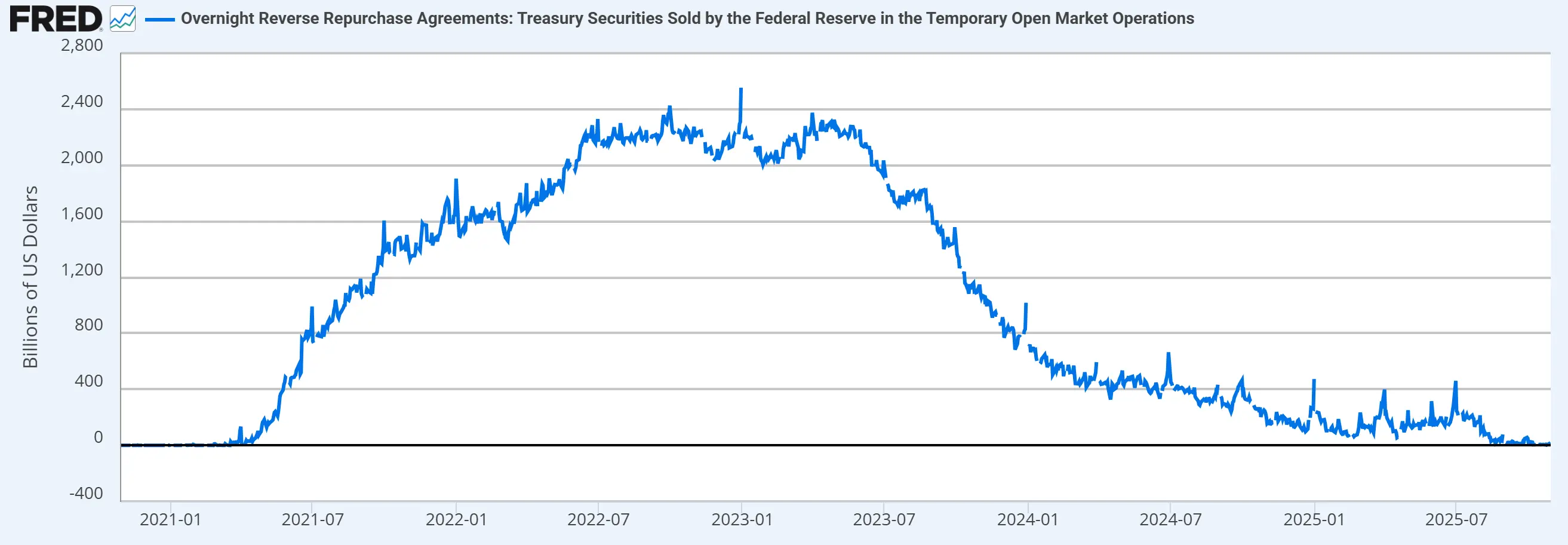 The overnight reverse repurchase agreement tool is the Fed's mechanism for withdrawing liquidity from the market, working in conjunction with the balance sheet reduction to manage bank reserve levels. Data shows that since August of this year, the reverse repurchase tool has been drained and can no longer release liquidity.