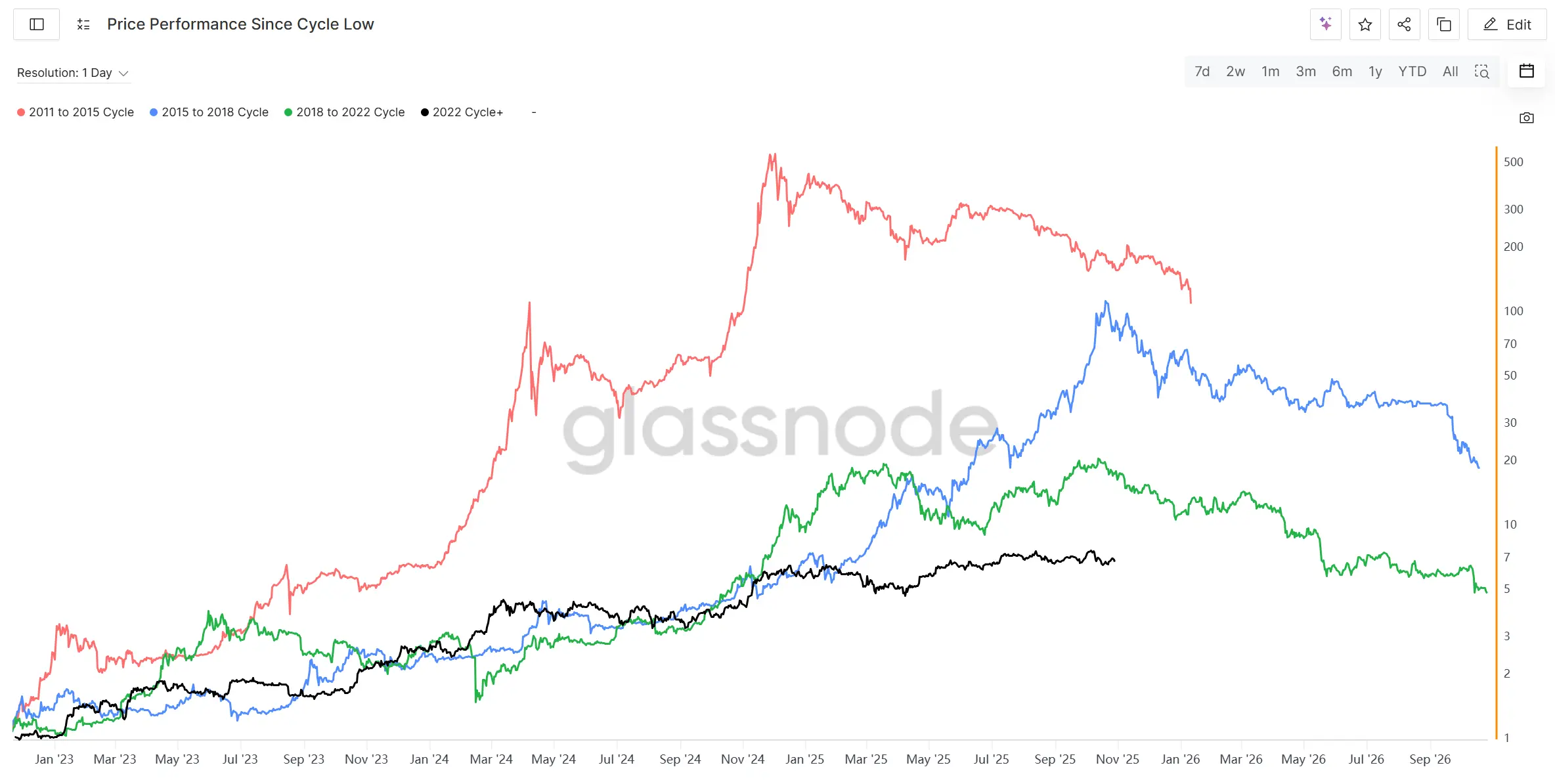 Figure 7. BTC Performance Across Cycles (Source: Glassnode)
