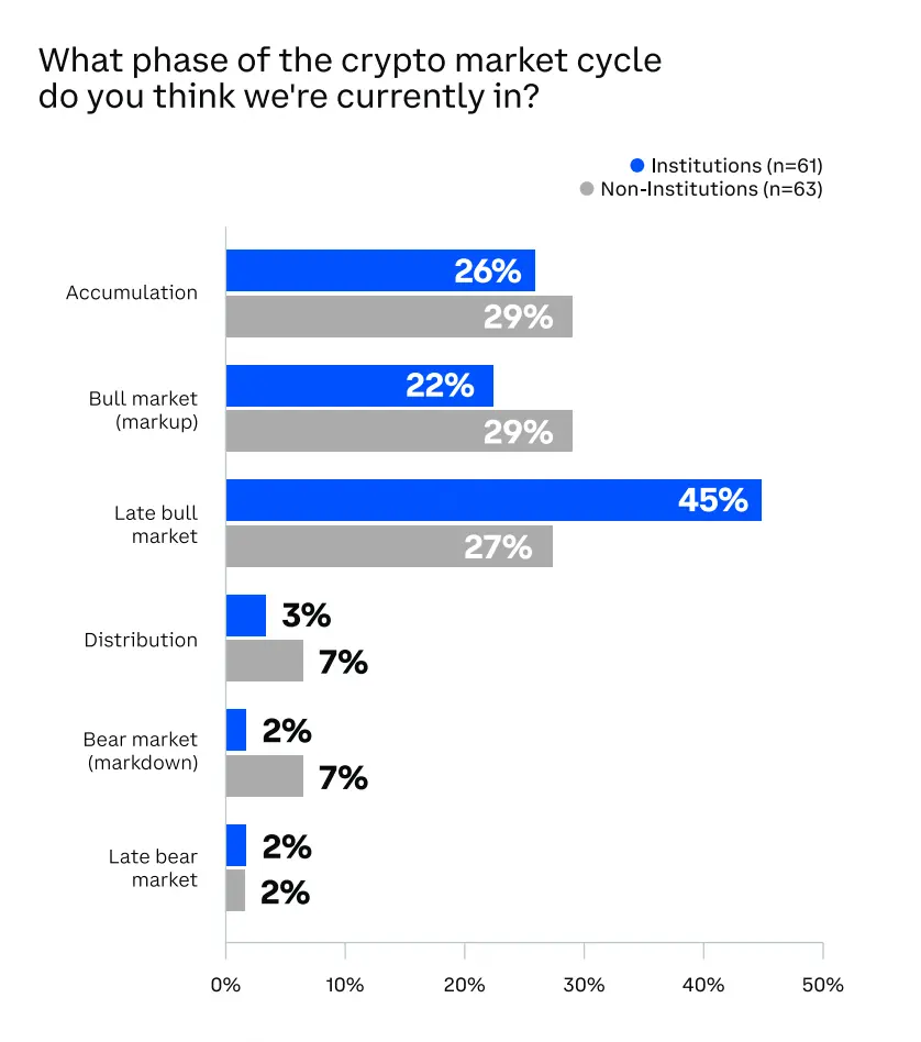 A survey conducted by Coinbase at the end of September among over 120 institutional and retail investors revealed notable insights regarding the current stage of the crypto market. A significant 45% of institutional investors believe the market has entered the late stage of a bull market, while 27% of non-institutional investors share this view. Following the October 11 liquidation event, this percentage is likely to concentrate even more towards the late bull market and peak distribution phase.
