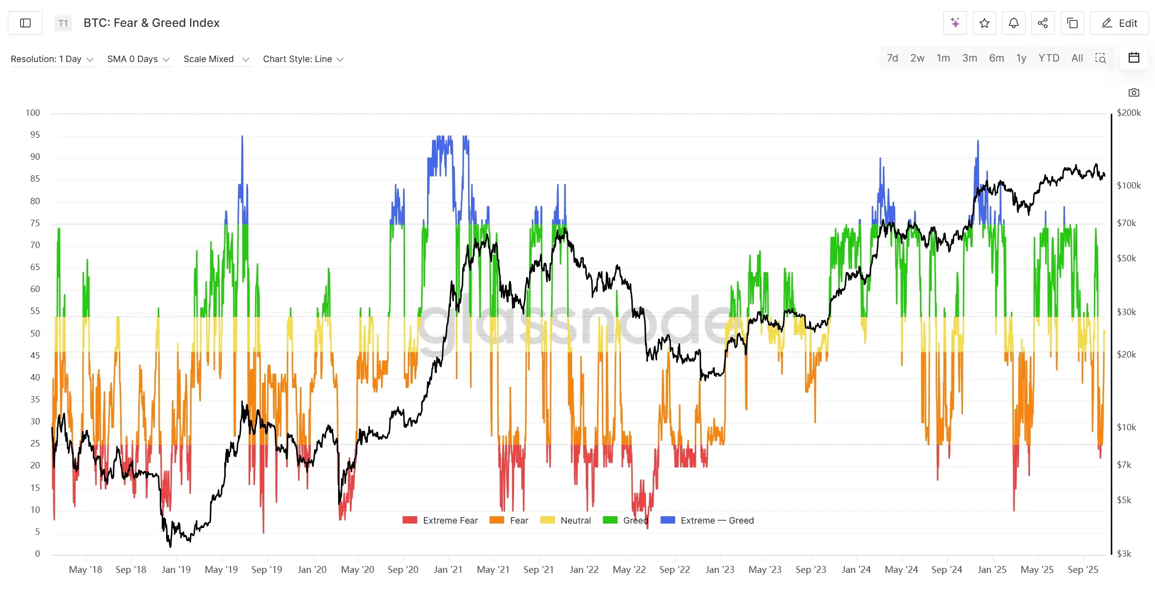 Additionally, over $20 billion in nominal value of long positions in the futures market have been liquidated, leading to a significant number of leveraged long positions being forcibly closed, making it difficult for the market to gather enough momentum to form an upward trend in the short term. Furthermore, the market's fear index (Crypto Fear & Greed Index) quickly fell to around 20 points, a relative bottom, after the October 11 event. Although BTC prices have stabilized, the overall index remains in a bottoming phase, indicating that market sentiment is in a state of extreme caution or even panic, but this also means that potential rebounds will require time to digest risks.