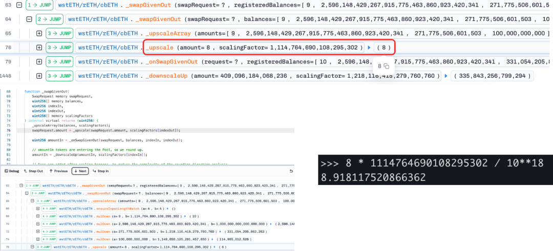 Second Stage: The attacker uses a carefully constructed amount (= 8) to swap between another underlying asset (wstETH) and cbETH. Due to rounding down when scaling the token amounts, the calculated Δx is slightly smaller (from 8.918 to 8), leading to an underestimation of Δy and causing the invariant D (from Curve's StableSwap model) to decrease. Since BPT price = D / totalSupply, the BPT price is artificially suppressed.