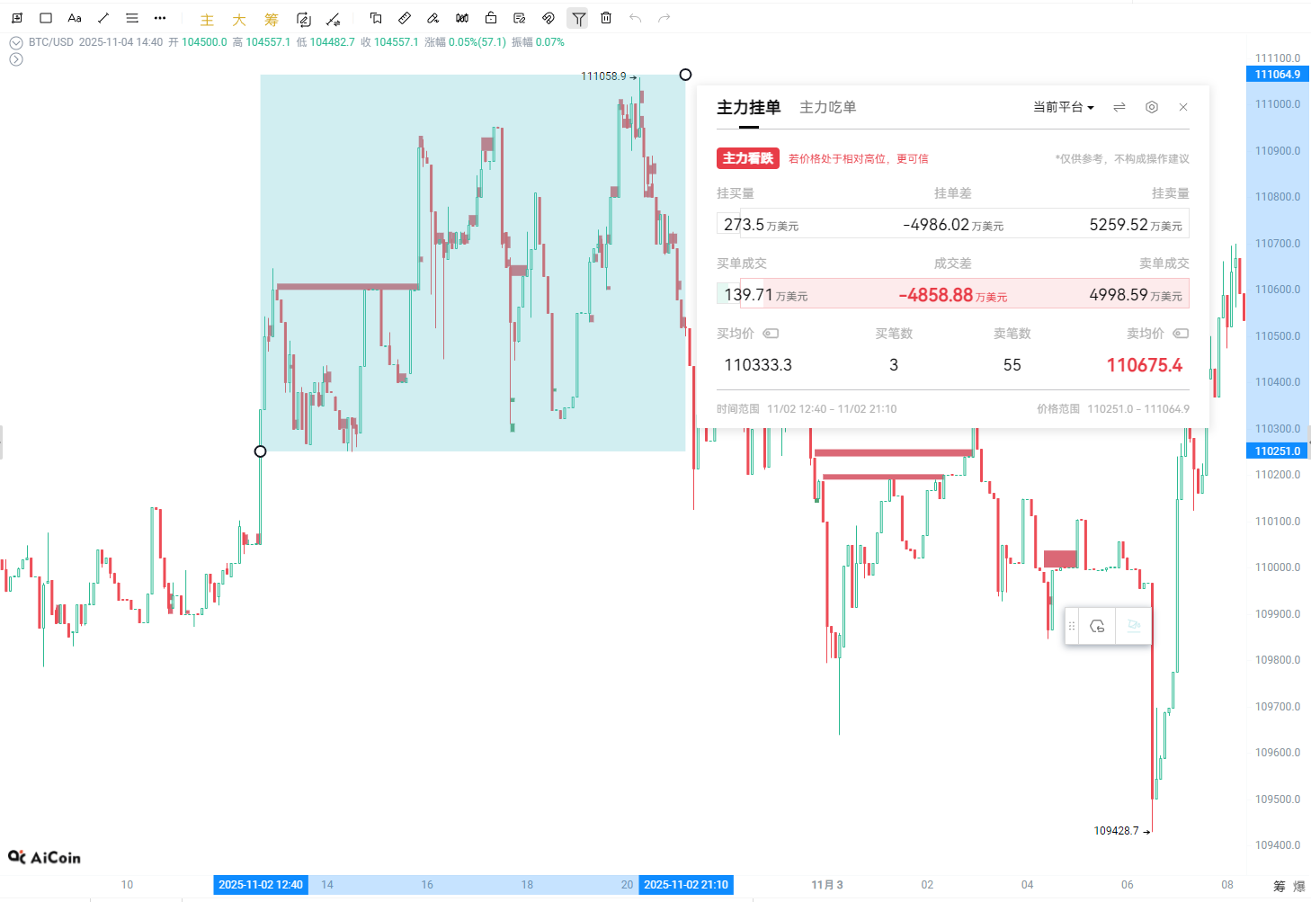 Here, a golden signal emerges that only PRO (www.aicoin.com/vip) users understand: Coinbase spiked down independently, while Binance/OKX did not follow suit. Based on past performance, such independent spikes in the U.S. market usually indicate that the market will retest this spike's low. The "Main Player Transactions" indicator here signals that the main players have begun to take the initiative, confirming downward momentum, and based on cross-market price differences, it provides an excellent reference for a "target level"—$108,800.
