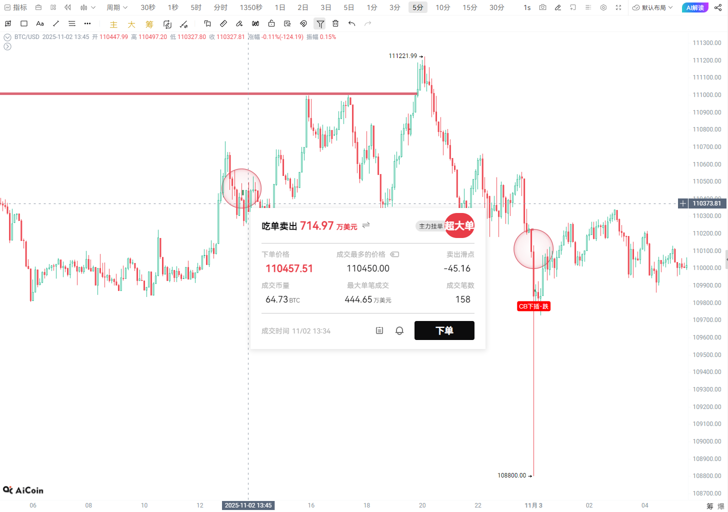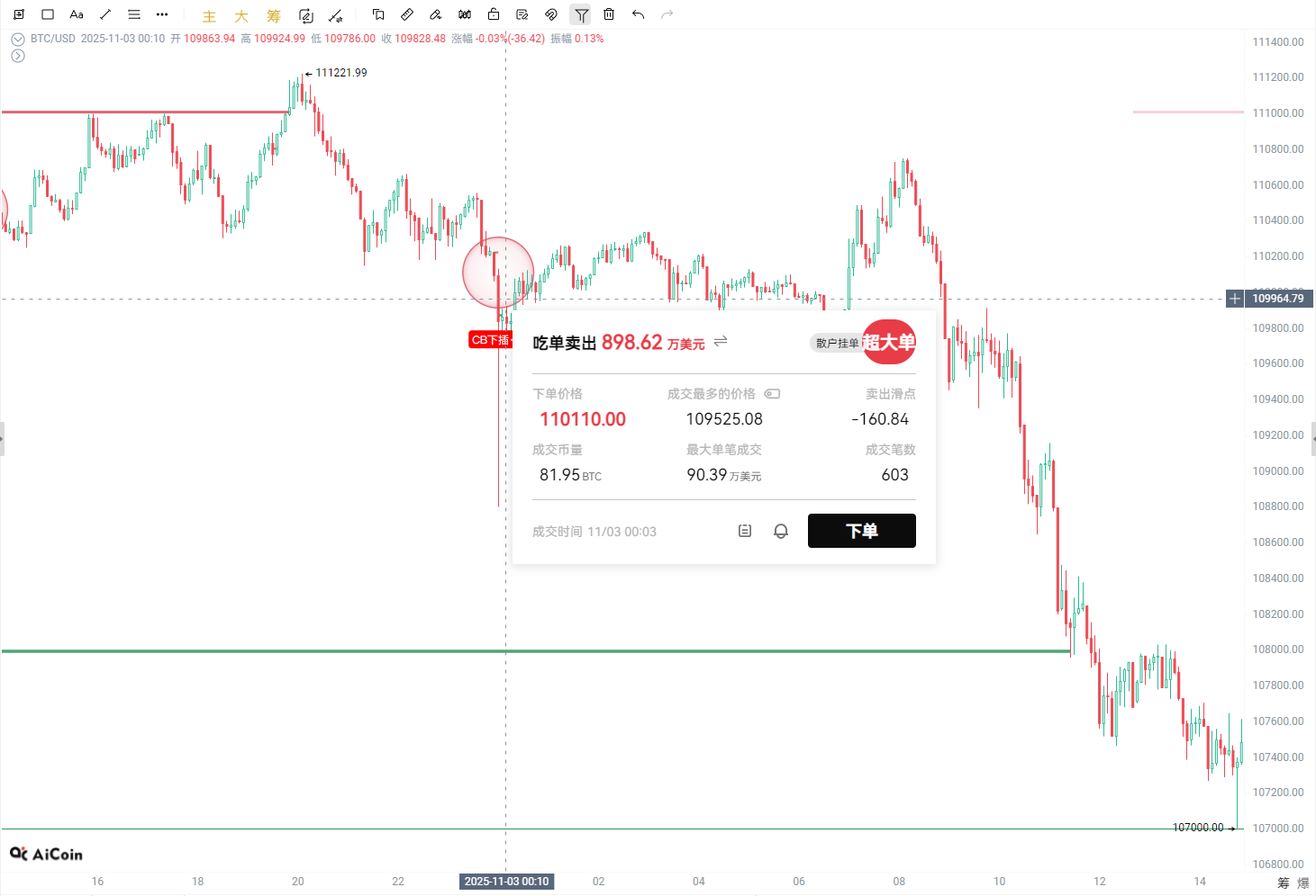 Interpretation: The market sell orders differ completely in logic from Kraken's limit sell orders. This is a cost-agnostic, speed-driven sell-off aimed at instantly breaking through market liquidity, creating panic and triggering chain stop-losses. Indeed, the second large order directly caused Coinbase's price to spike down to $108,800.