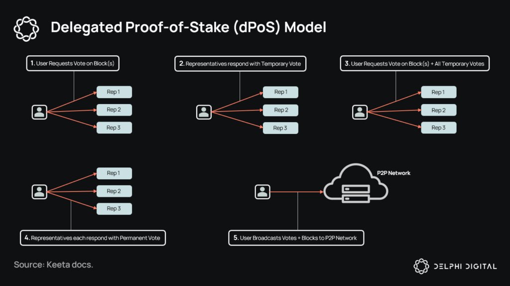 Consensus runs on delegated proof of stake with a layered validation process where representatives provide temporary votes before committing permanent ones.