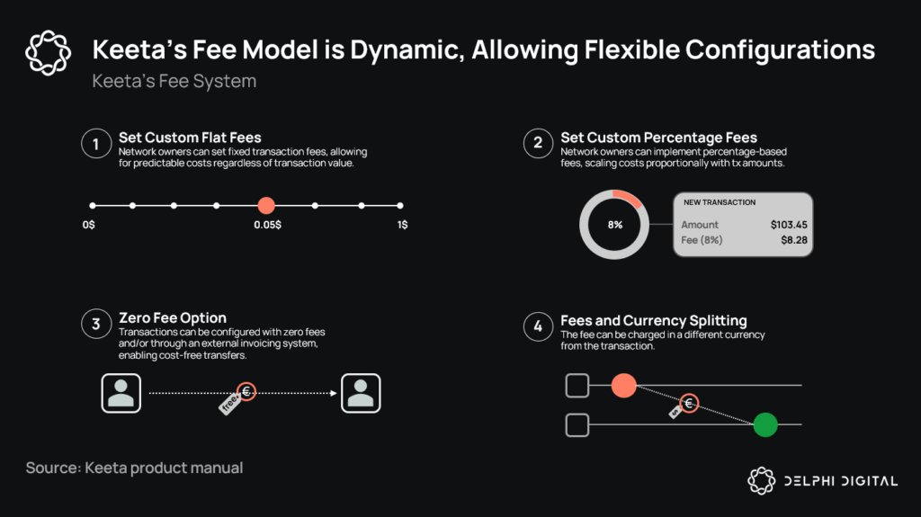 Keeta also addresses potential spam attacks through a dynamic fee system. Network owners can configure flat fees, percentage based fees, zero fee options, or split fees across currencies.