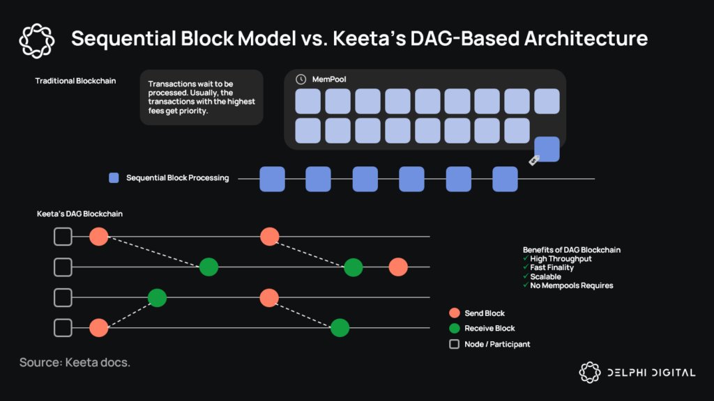 Keeta uses DAG architecture where each account maintains its own chain of state transitions. Transactions process in parallel across the network rather than waiting in a single queue.