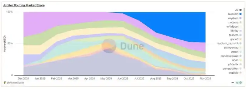 • HumidiFi 占据 Jupiter 专业做市商路由 54.6% 的份额
