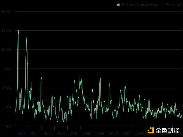 比特币的情况同样如此。随着比特币从早期适用者转向机构投资者,且作为一项技术逐渐成熟,它已不再像十年前那样面临生存层面的风险,作为资产类别的成熟度显著提升。这一点从比特币的波动率中可清晰看出——自2024年1月比特币ETF开始交易以来,其波动率已大幅下降。