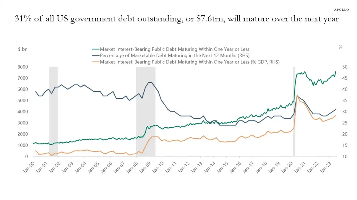 31% of U.S. government debt (about $7 trillion) will mature in the next year, along with new debt issuance, potentially reaching a total of $10 trillion | Source: Apollo Academy