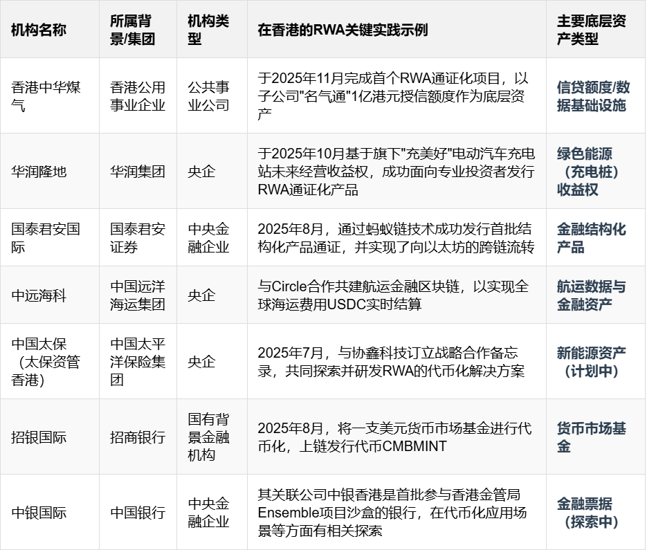 This series of intensive dynamics from market practice to top-level policy clearly indicates that Hong Kong is fully committed to building its digital financial ecosystem. Central enterprises, state-owned enterprises, and related financial institutions in Hong Kong, leveraging their unique asset endowments and policy sensitivity, have become the backbone of promoting the development of the RWA ecosystem.