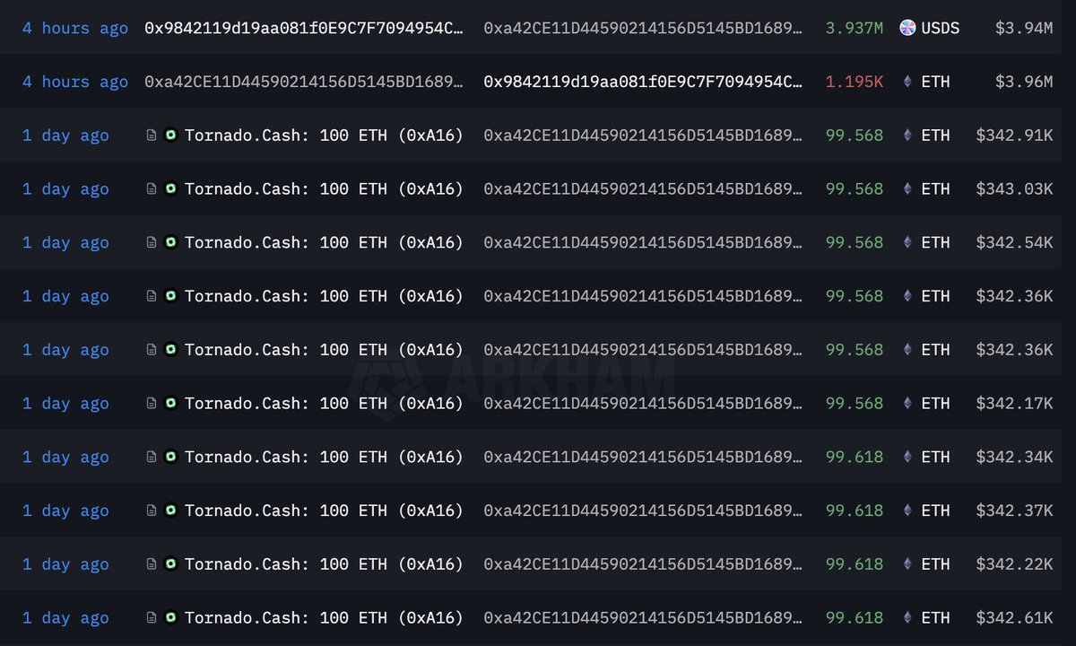 三个新钱包刚刚从 http://Tornado.Cash 提取了 4,920 $ETH(价值 1,625 万美元),并以大约 3,302 美元的价格出售。