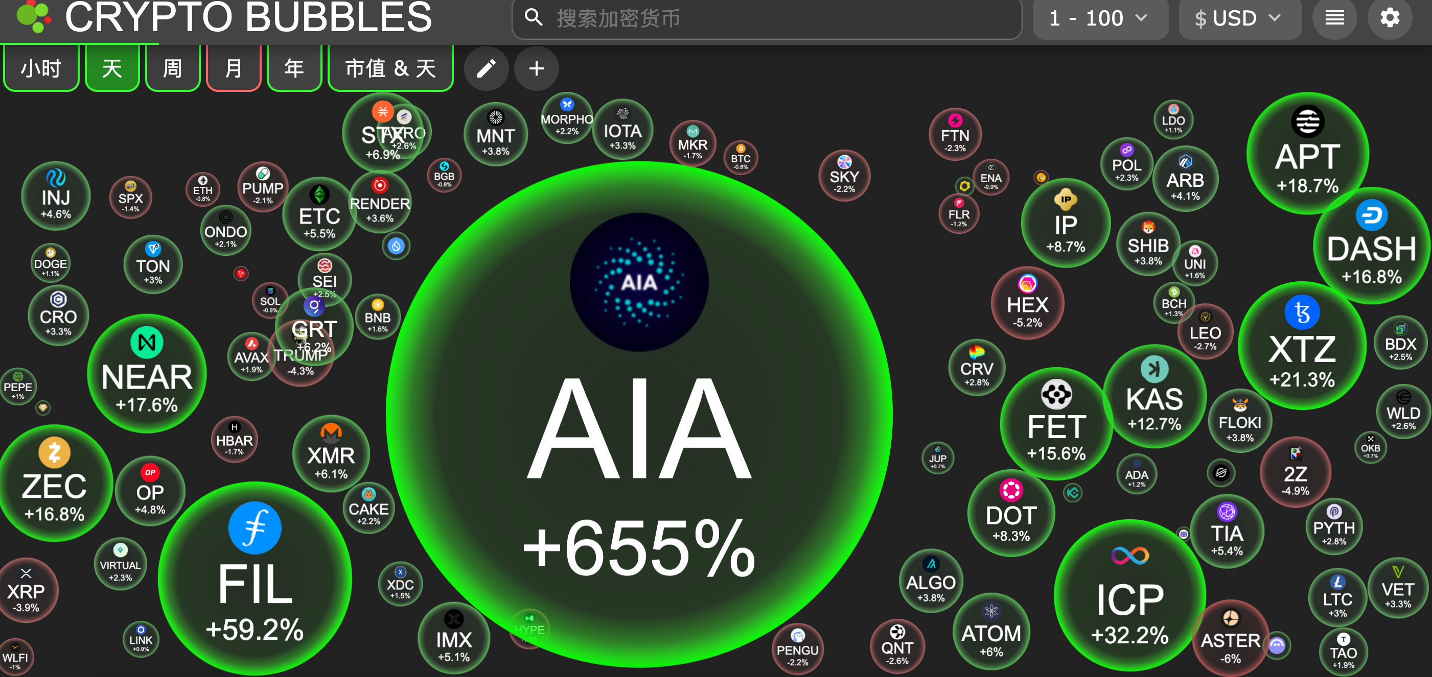 今日市值前100币种最大涨幅:DeAgentAI涨655%、Filecoin涨59.2%、Internet Computer涨32.2%、Tezos涨21.3%、Aptos涨18.7%。