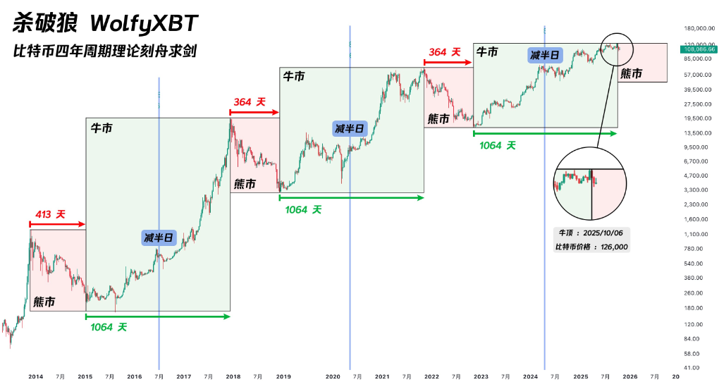 每次减半后约十几个月,比特币都会达到周期性高点,随后进入熊市调整。当前距离2024年4月减半事件已过去18个月,正处在周期尾部的敏感阶段。