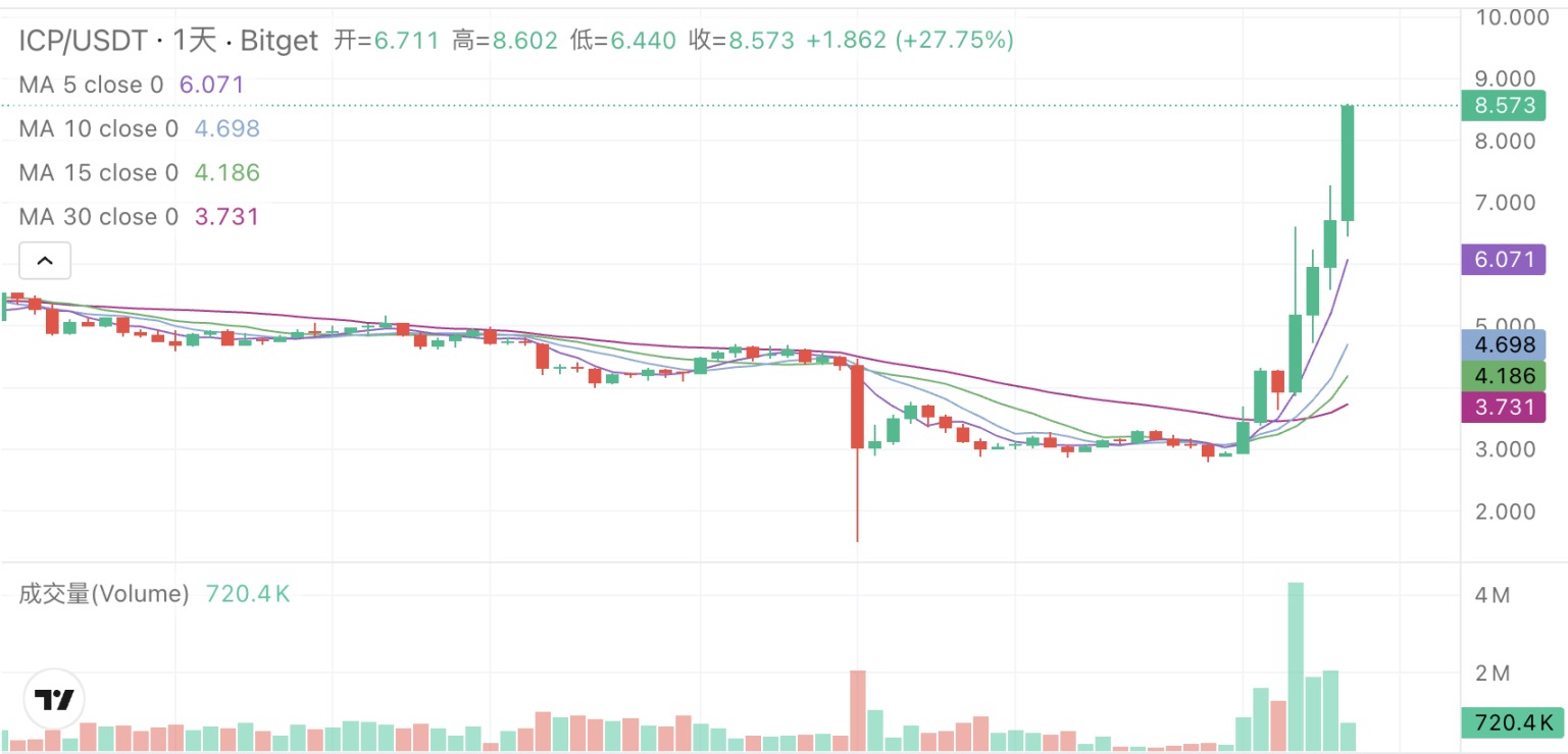 11 月 1 日开始,许久没有声音的 Internet Computer(IC)代币 ICP 启动了一轮上涨。据 Bitget 数据,ICP 价格从 2.94 美元附近一路涨至最高 8.6 美元附近,7 天上涨了近两倍。