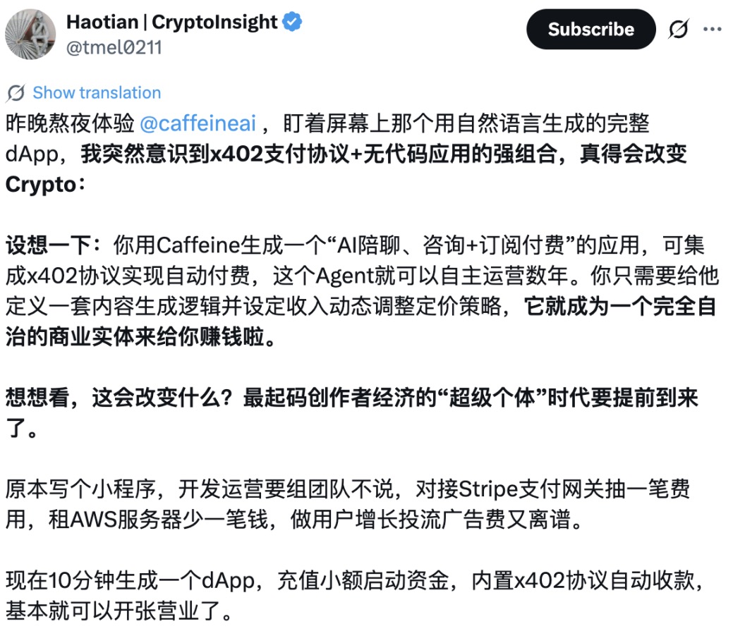 X 用户 Haotian 于昨日下午对 caffeine 可能为 AI 支付带来更多改变的观点,也进一步让中文市场的情绪发酵。