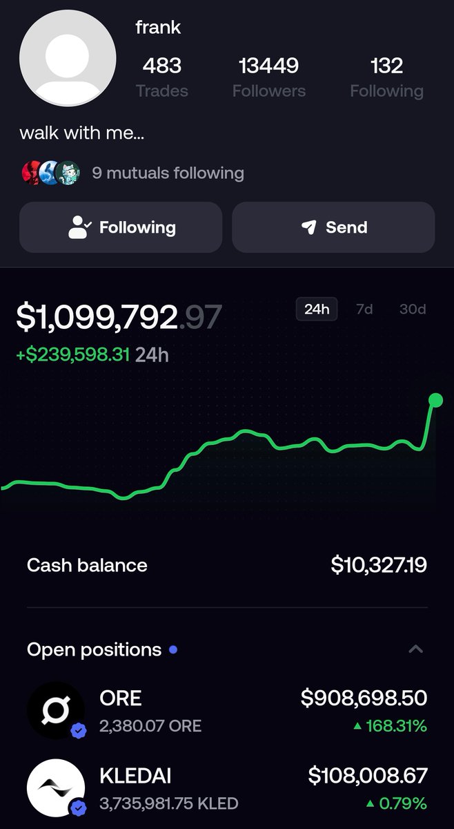 @frankdegods 目前粉丝 1.3 万,总浮盈近 80 万美元。