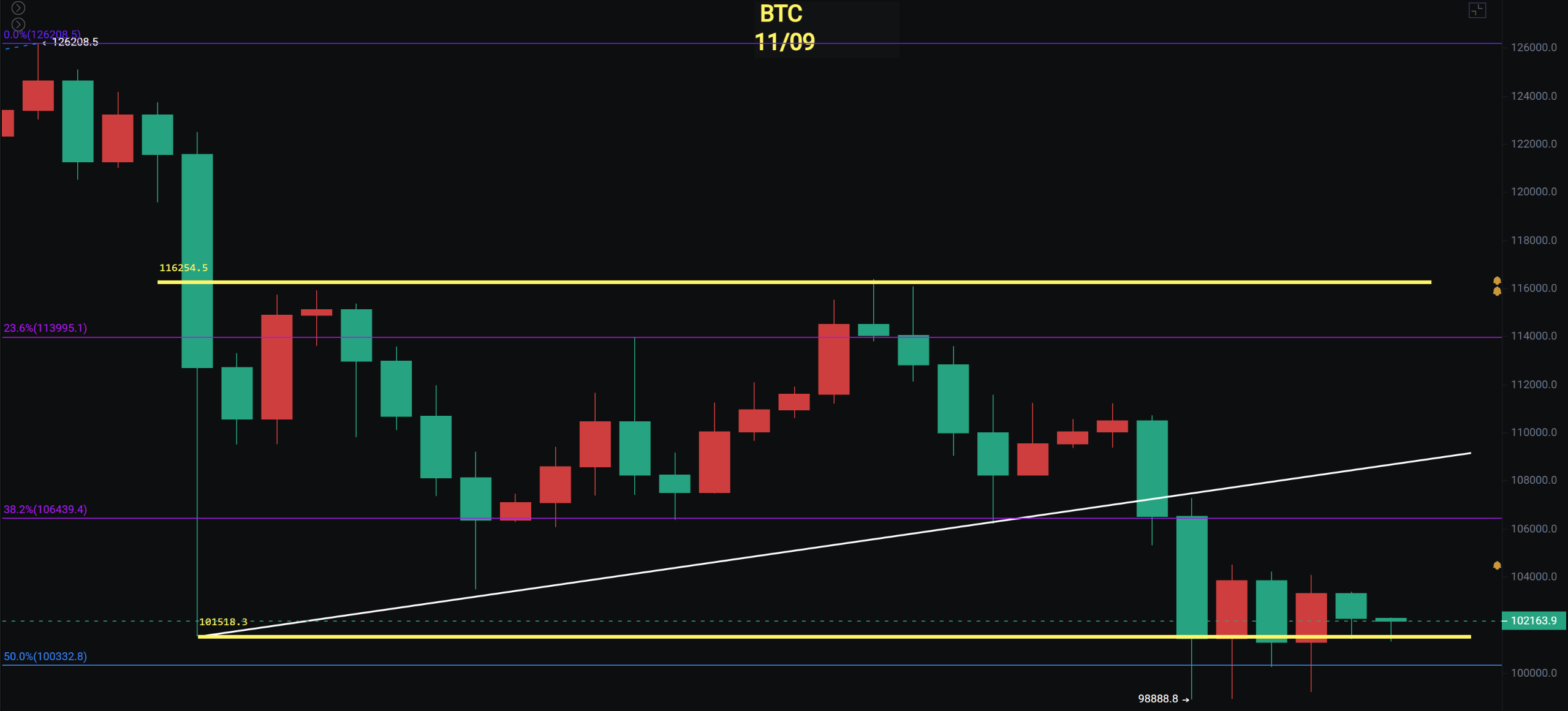 比特币最低插针 98888.8,近五天一直在 100000 左右震荡向下且有插针。下周的开盘至关重要,周线靠近 MA60,过去几年该位置始终未被跌破,因此这一轮下跌靠近此处仍会有反弹,但反弹高度暂不确定。目前市场仍处于寻底与探底过程中,一个积极现象是 10 月 10 日插针的底部已收回,且价格跌至斐波那契 0.5 附近。