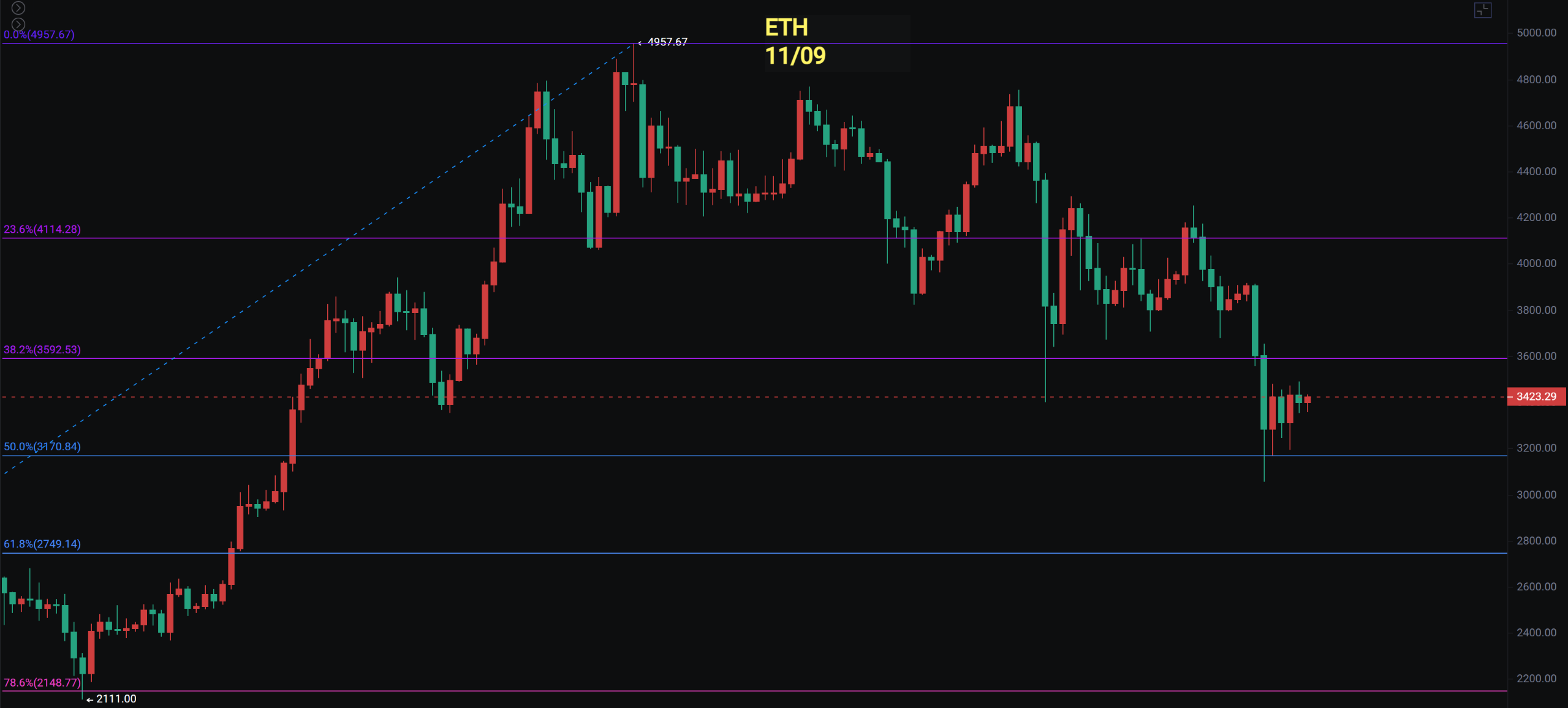 以太走势相对更弱,周线触及 MA60 后插针,此前 6 周出现两组“双阴夹阳”的看跌信号。日线仍未收回插针区间,且日线级别价格同样跌至斐波那契 0.5 附近,而 0.5 至 0.618 区间为强支撑。