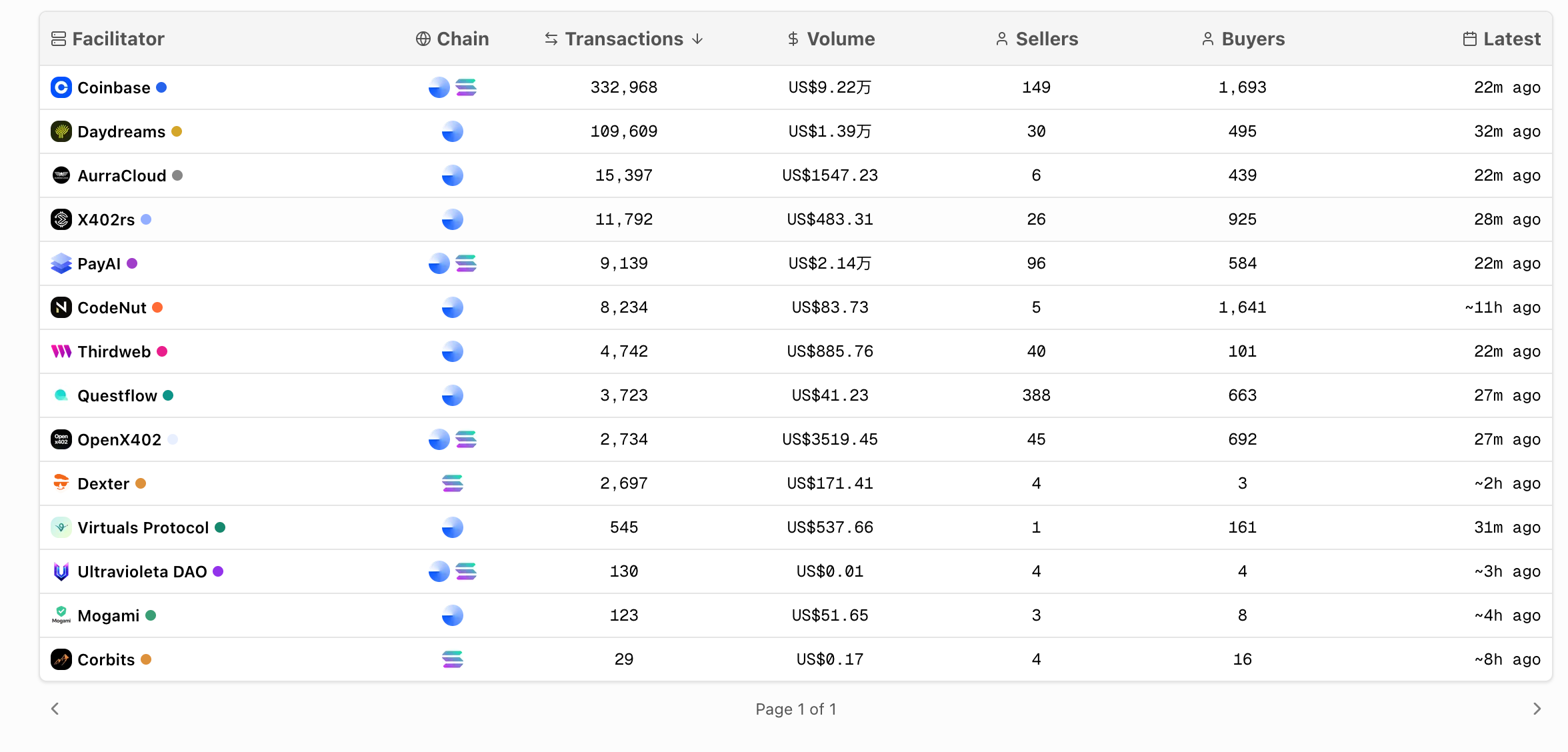 Looking at the token distribution provides further insight. A staggering 98.7% of the transaction volume in the entire x402 ecosystem uses USDC, while the remaining 1.3% is spread across USD1, USDT, ETH, and a dozen other tokens.