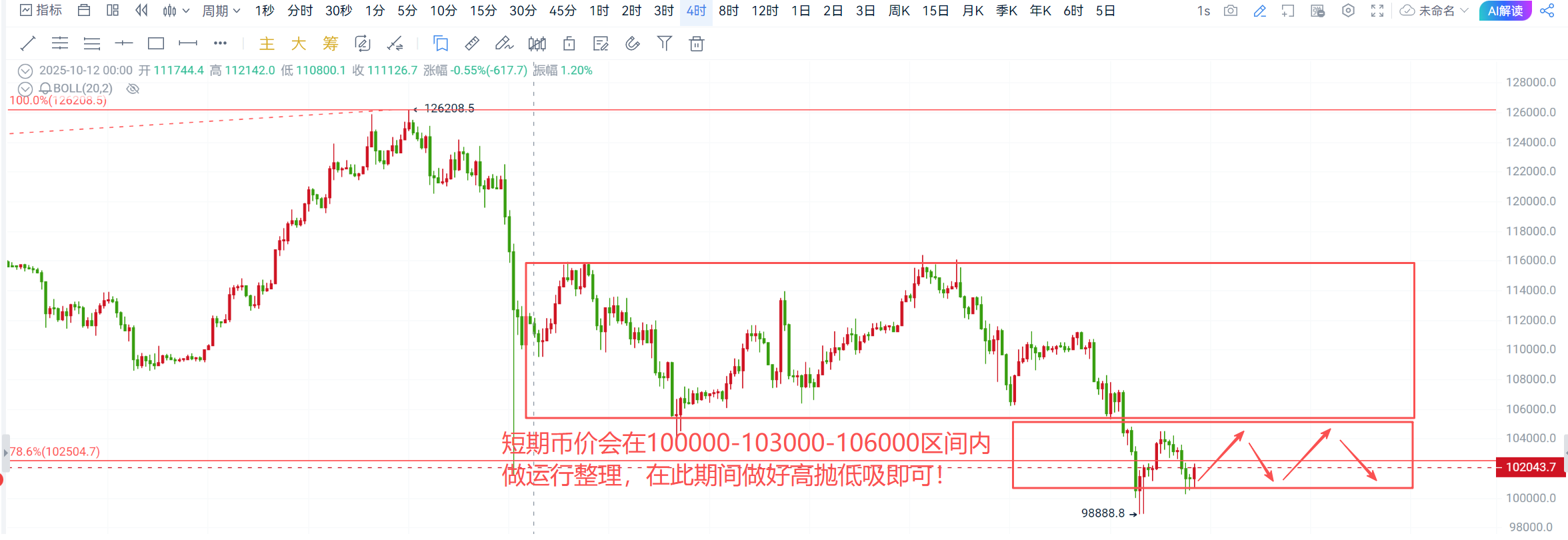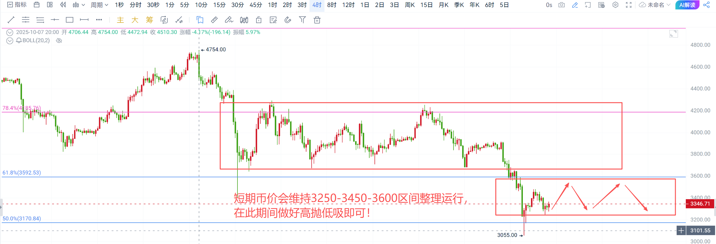Last Friday's article mentioned that, from a daily chart perspective, Bitcoin and Ethereum are showing alternating bullish and bearish candlesticks, and they have not broken new lows for three consecutive days. Therefore, the probability of the market consolidating after an oversold condition, as previously analyzed, continues to rise. The temporary ranges can be referenced as Bitcoin 100000-102500-104500-106500 and Ethereum 3250-3350-3450-3650. Before breaking these ranges, one should focus on high selling and low buying accordingly. It was also intentionally mentioned that the current upper resistance level has not yet been reached, and adjustments can be made based on the situation. If the range is broken, one can consider entering with a light position! Then, from a 4-hour perspective, although the market has tested lower levels twice, it still has not broken the previous lows. Following the aforementioned range strategy, it is an excellent opportunity to position long. I wonder if everyone has kept up?