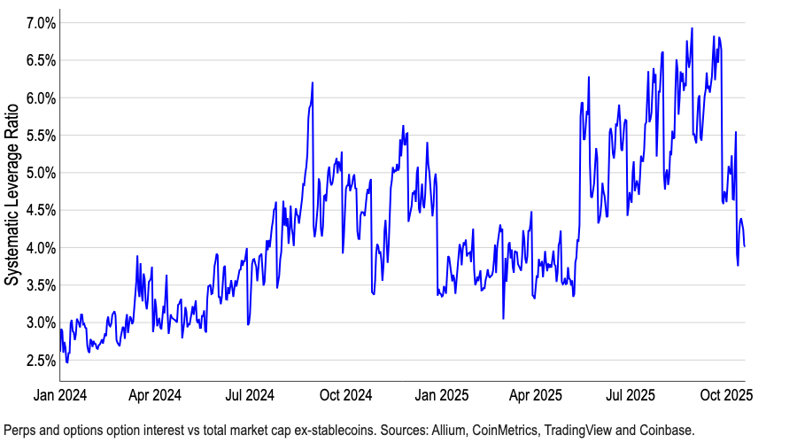 然而杠杆水平已基本重置——我们的系统性杠杆比率(基于衍生品总未平仓合约除以加密货币总市值,不含稳定币)显示当前水平仅略高于年初(图表2)。我们认为,该指标将成为中短期内最关键的监测数据之一。当前杠杆比率表明,在风险管控措施协调统一且做市商深度完全恢复正常之前,市场仍将面临间歇性流动性缺口和更尖锐的风险尾部。