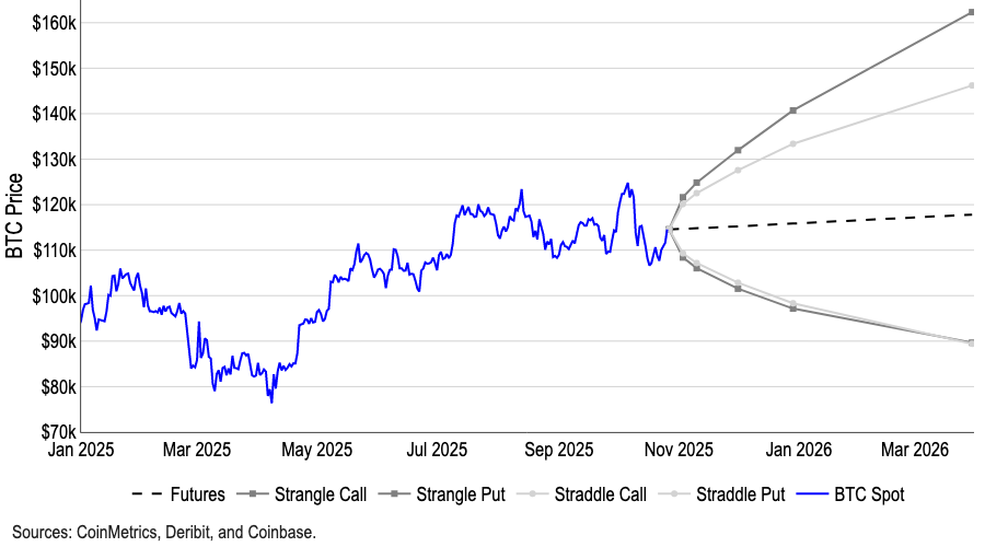 因此我们预计未来2-3个月比特币主导地位将逐步提升,这可能在市场最终轮动前对ETH/BTC及山寨币/BTC交易对构成下行压力。需注意,根据跨式和跨腿期权策略的盈亏平衡点,当前市场对未来3-6个月比特币价格的隐含概率分布区间为16万美元至9万美元,且预期呈现向上不对称偏向(图3)。