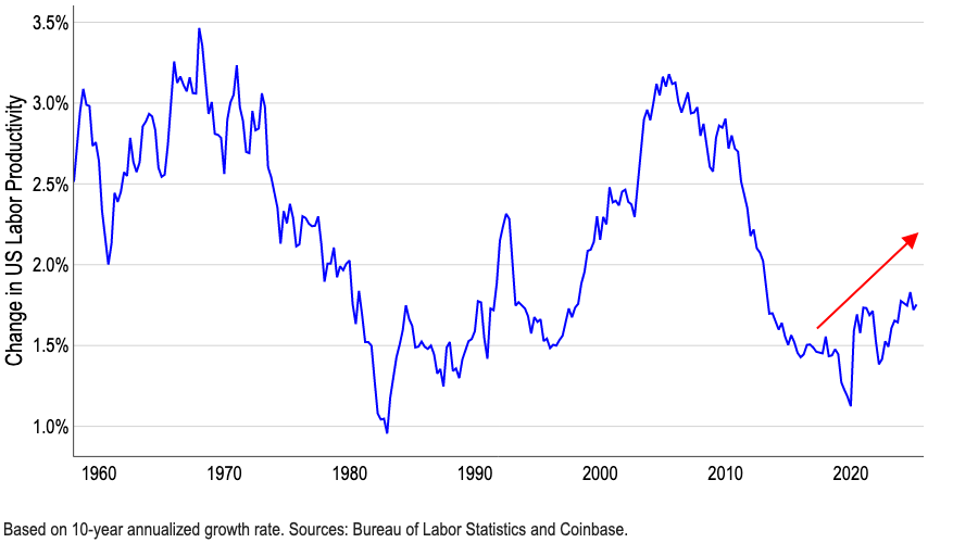 另一方面,若长期收益率确实随美国经济增长而上升,则更多反映经济基本面增强而非政策担忧。更快的名义增长和生产率提升能够吸收更高的贴现率,从而为风险资产(包括加密货币)提供有力支撑。值得注意的是,我们认为当前经济学家普遍低估了生产率水平——部分原因在于人工智能等因素正以官方统计未能完全捕捉的方式提升劳动力效率。