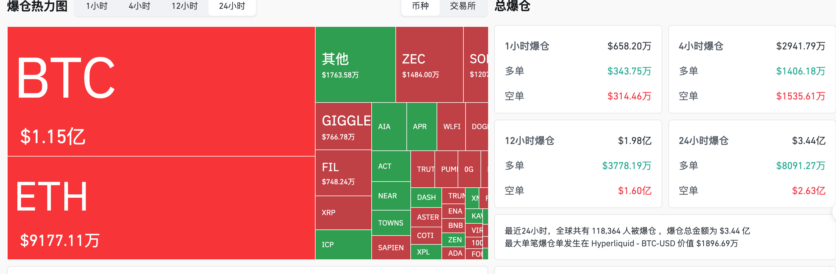 • 24-hour liquidation data: A total of 118,364 people were liquidated globally, with a total liquidation amount of $344 million, including $115 million in BTC, $91.77 million in ETH, and $7.66 million in GIGGLE.
