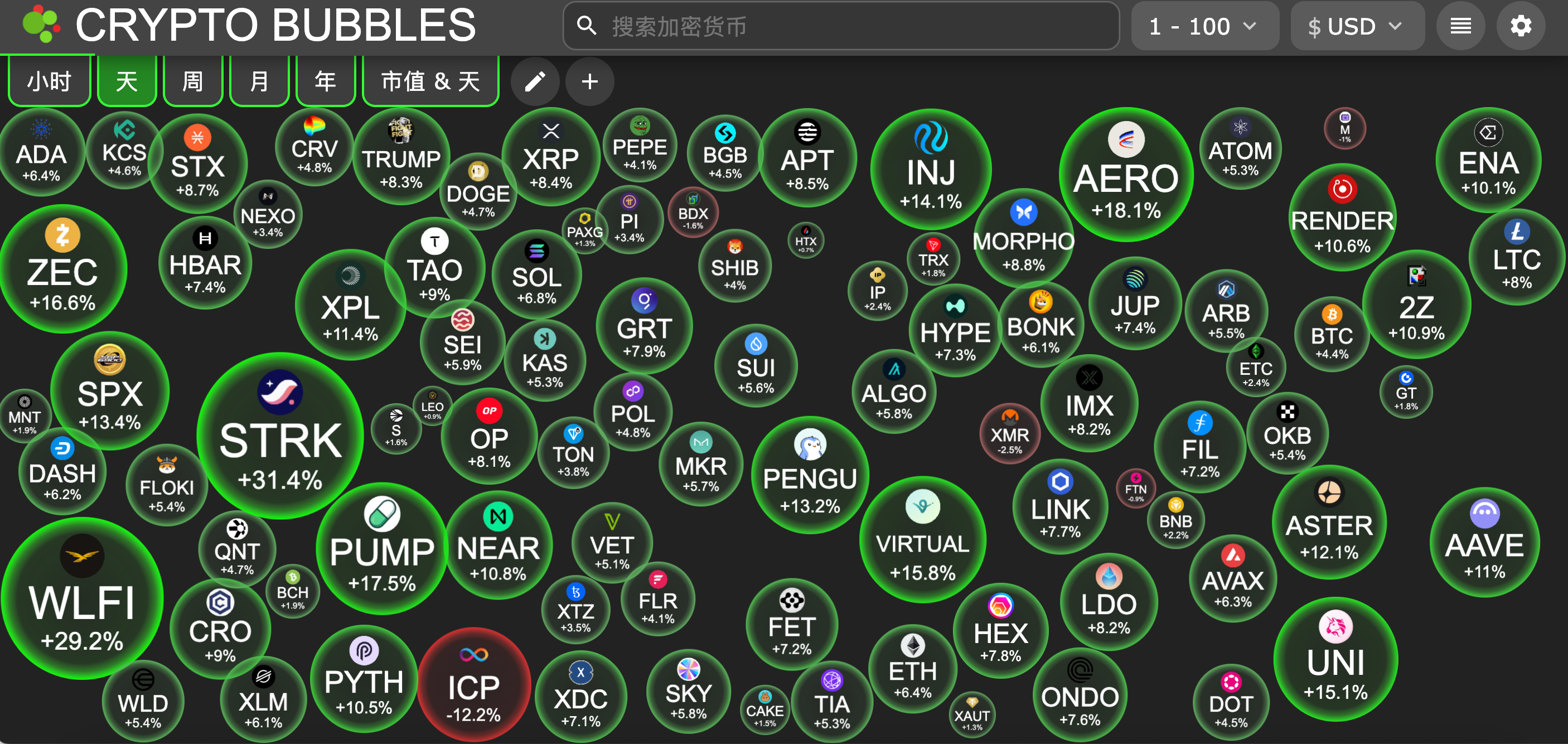 The largest gainers among the top 100 cryptocurrencies today: Starknet up 31.4%, World Liberty Financial up 29.2%, Aerodrome Finance up 18.1%, Pump.fun up 17.5%, Zcash up 16.6%.
